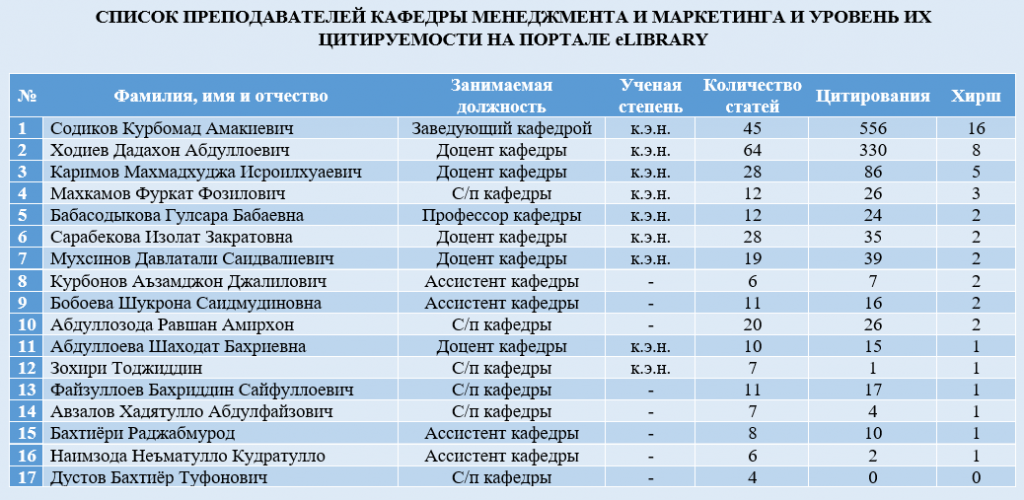 Научный рейтинг преподавателя кафедры менеджмента и маркетинга